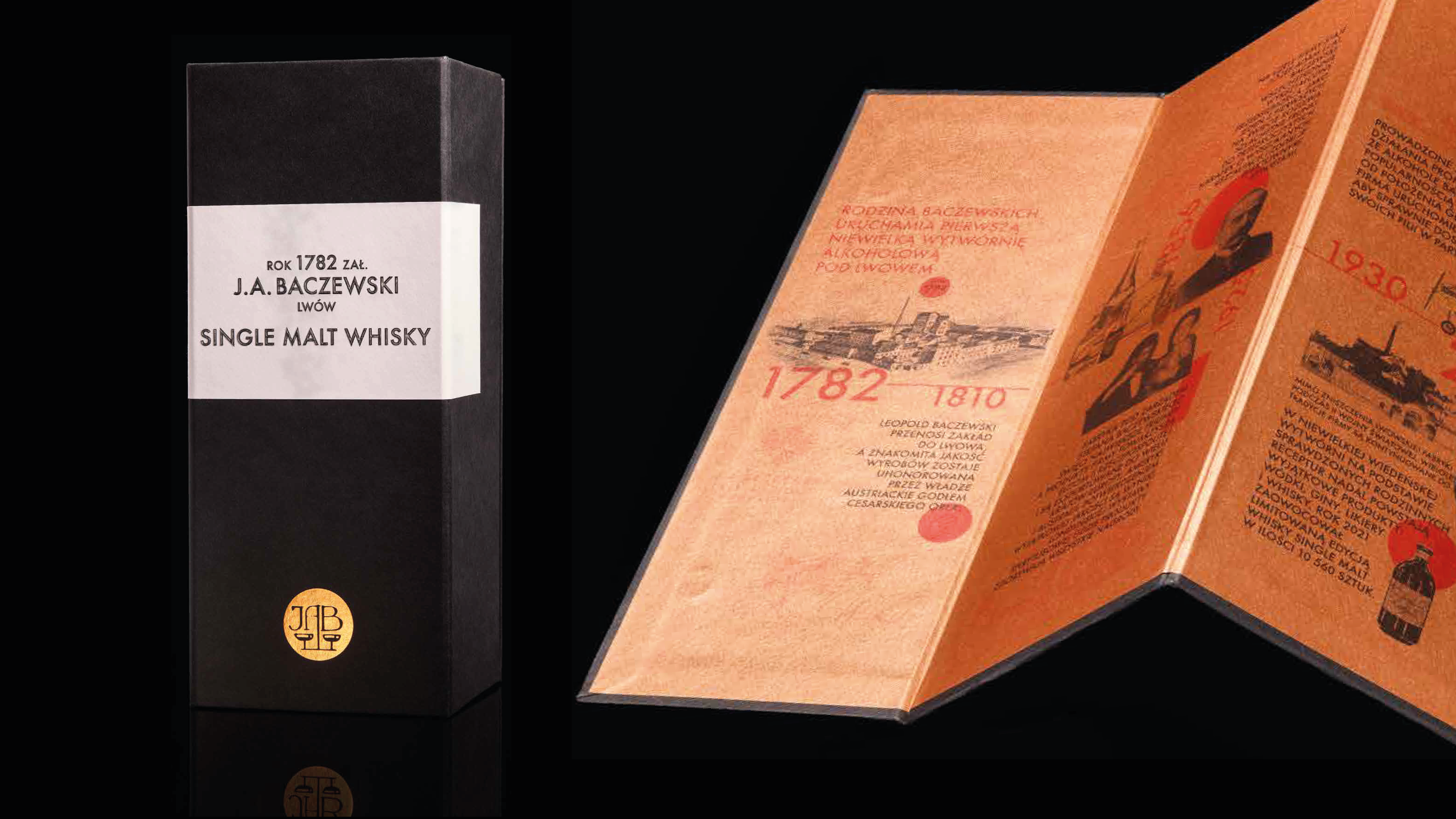 Minimalistyczna, wręcz aptekarska etykieta oraz katalogowa butelka zostały dostarczone przez klienta a kolorystyka marki, tak charakterystyczna dla świata whisky, ustaliła się już w tonacji miedzi, zlota i czerni, Stąd wybór tych kolorów z dodatkiem czerwieni na miedzianym tle, zastosowanych na matowym papierze był już poniekąd oczywisty, Aby jednak whisky Single Malt odróżnić z daleka od whisky Blended pudełko otrzymalo kształlt prostopadlóscianu pokrytego matową czernią z imitacją naklejonej białej opaski z typografią z etykiety na butelce. Ogromne możliwości dawalo też wnętrze opakowania.Chcieliśmy opowiedzieć obrazami i typografią podstawowe fakty z historii marki dowodzące, że nawet tak wymagąjący produkt jak whisky single malt, J A Baczewski produkował już 100 lat temu. Powstało kalendarium wykorzystujące materiały z rzeczywistych historycznych druków marki. Wyzwaniem drukarskim okazało się utrzymanie odpowiedniego nateżenia czerni i czerwieni na złotym pdkładzie a także odpowiednio precyzyjna introligatornia umiejąca spasować awers i rewers pudelka zamykanego magnesikiem.
