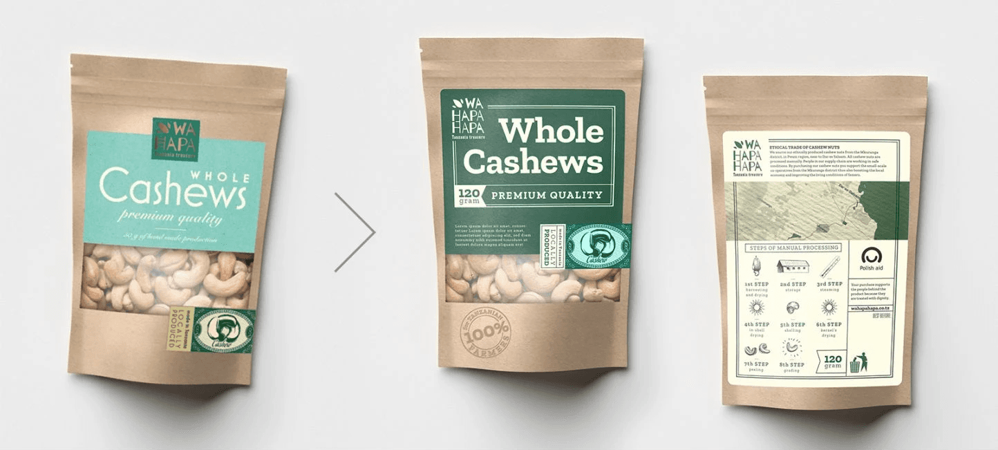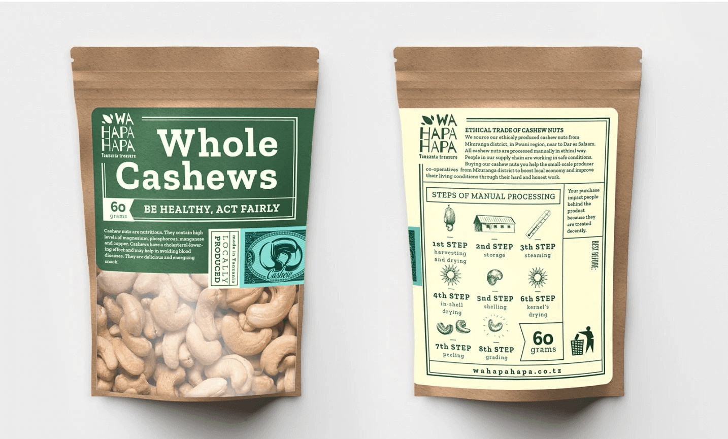 Jednak istotą strategii i faktycznym wyróżnikiem marki, było pokazanie, że za tym produktem stoją konkretni rolnicy a właściwie rolnicze spółdzielnie czy też kooperatywy. Zostały ona wskazane i wymienione na opakowaniu. Dodaliśmy też komunikat, że część z dochodu jest przeznaczona na wsparcie lokalnego rolnictwa. Daliśmy tym samym marce Wa hapa hapa tożsamość, wyjątkowość i autentyczność nie komunikowane przez żadnego innego tanzańskiego producenta. Całości dopełniał claim „Tanzania treasure”, który zawłaszczył niejako „tanzańskość”naszych orzeszków czego nikt inny nie odważył się zakomunikować.